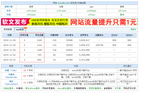 通过上面的分析,关健字百度指数高,流量就越高。理论上说是这样的,但给网站带来的预估流量,就根关键字的排名有关了。如下图:文库这个关健字的百度指数很高,但给网站的流量却为0,因为排名很差。